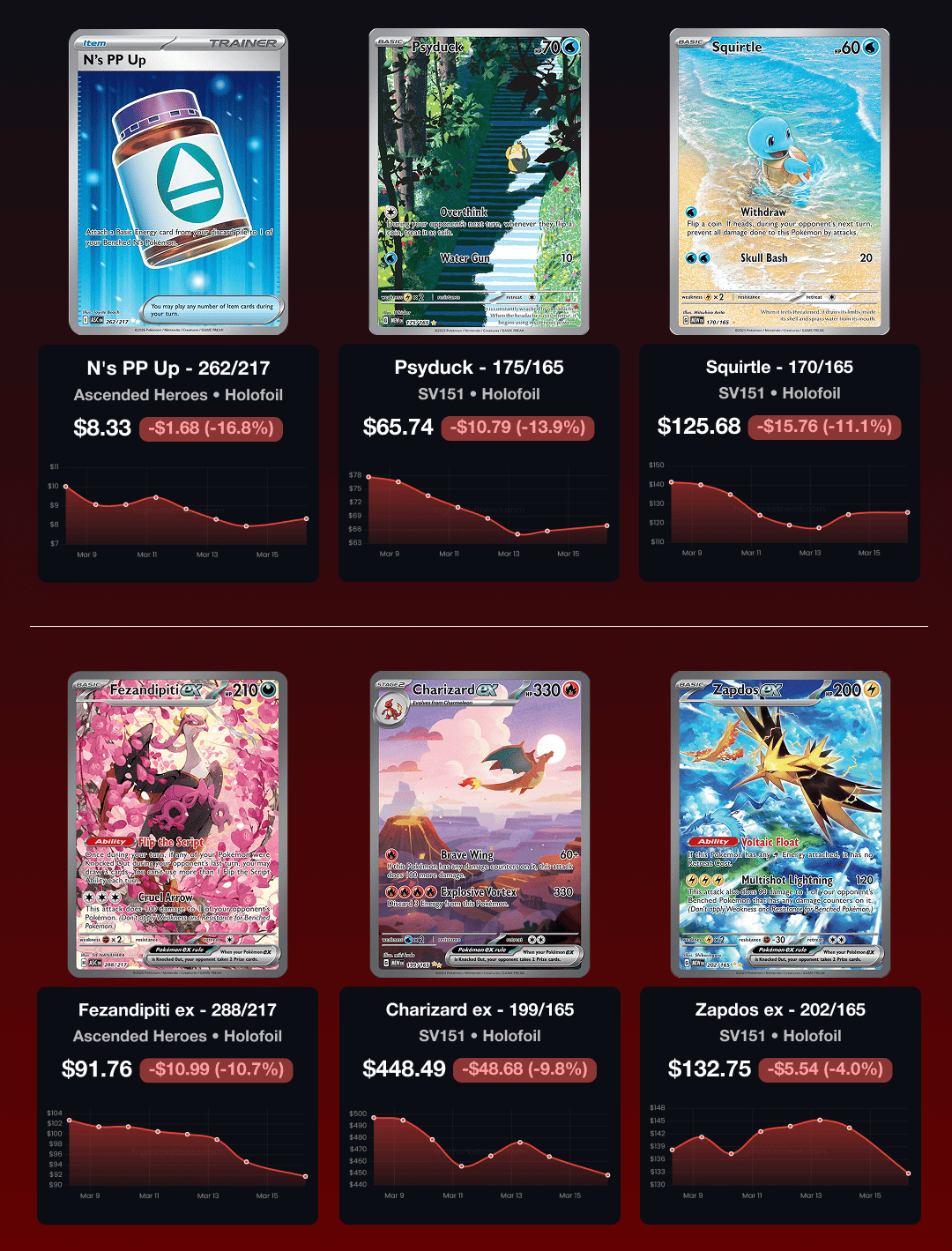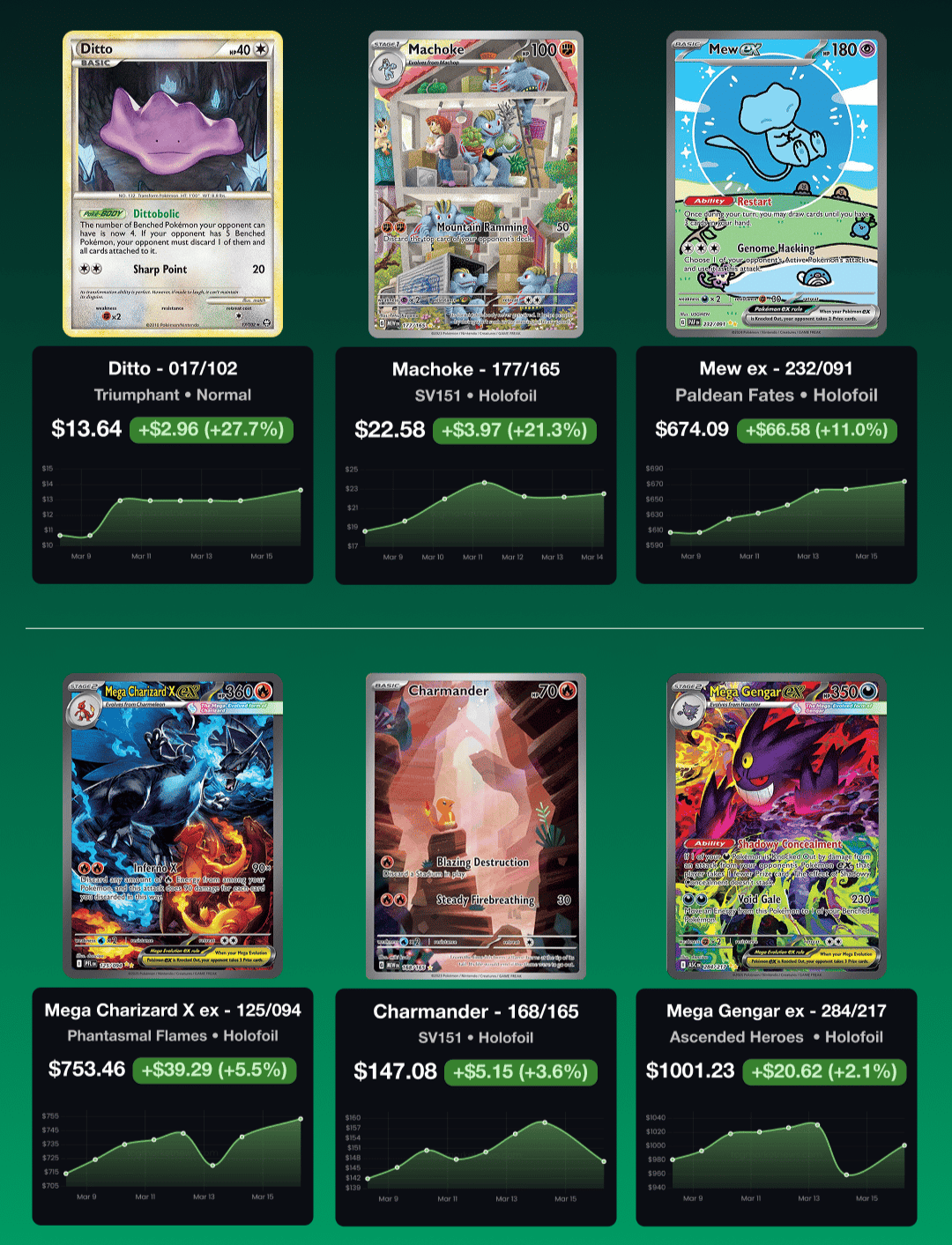 March 9th - March 15th, 2026 📰 TCG News Note: Some updates may touch on wider Pokémon news beyond the TCG. 🔵 “Aura Seeker” Trademarked as Upcoming Pokemon TCG Set A new trademark for “Aura Seeker” (ハドウシーカー, Hadou Seeker) has been filed by The Pokemon Company under the same product classifications used for TCG set names. The word “hadou” refers to the concept of aura tied to Lucario’s ability to sense living beings and manifest wave-like energy, strongly suggesting the set will feature Mega Lucario Z as the Mega Evolution block continues. Trademarks have recently been revealed out of order and sometimes up to a year ahead of schedule, making the exact release window unclear. The known 2026 TCG roadmap already includes Chaos Rising, Abyss Eye (likely Mega Darkrai ex), Storm Emeralda (likely Mega Rayquaza ex), and the 30th anniversary Celebration Collection set in October. 🔵 Ditto Cards Surge in Price Following Pokemon Pokopia’s Switch 2 Launch Classic Ditto cards are seeing notable price spikes following the release of Pokemon Pokopia, the new Switch 2 exclusive where Ditto plays a starring role. The Delta Species Ditto (Squirtle) 040/113 reverse holo jumped 174% to $245 after holding steady for roughly a year, and vintage Ditto singles like the Pikachu variant (063/113) continue to see small but frequent increases. The surge appears to be driven by renewed interest in the character rather than artificial manipulation, with the game’s strong reception reminding collectors why Ditto has lasting appeal. Notably, modern Ditto cards like the VMAX from Shining Fates have not benefited from the same trend and have actually declined, suggesting the price movement is concentrated in older, out-of-print singles that cannot be reprinted. 🔵 Chaos Rising Revealed as Fourth Mega Evolution Set, Releases May 22 Chaos Rising has been officially revealed as the fourth English Mega Evolution expansion, releasing May 22 with prereleases running May 9-17. The set is headlined by Mega Greninja ex and features over 120 cards, including Mega Pyroar ex, Mega Floette ex, and Mega Dragalge ex. It draws primarily from Japan’s Ninja Spinner set, which releases March 13. The set continues a trend of smaller English releases, with an 86-card base set plus secret rares. Ongoing global TCG shortages may be driving Creatures to design fewer new cards per set in order to free up printing capacity. The ETB promo will be Fennekin’s Illustration Rare, pulled from the main set, as Froakie’s IR forms a connected artwork with Frogadier and Mega Greninja ex that would have been left incomplete. 📈 Card Trends Source: Price data provided by TCGPlayer.com and chart visual provided by TCGMarketNews.com (which sources data from TCGPlayer). Weekly Top Gains 🔼 Weekly Top Losses 🔼 📦 Sealed Product Sales Highlights 🔵 EX Hidden Legends Booster Box Sells for $20k Listing EX Hidden Legends is themed around the legendary Regi trio, Regice, Regirock, Registeel - all featuring a cool “cracked ice” holo effect. Sealed Type - Year: Booster Box - 2004 🔵 Lot of 3 Japanese McDonald’s e-Minimum Booster Packs Sells for $10.5k Listing These booster packs were sold exclusively at Japanese McDonald’s locations for a limited ~1 month window from Jan to Feb. 2002, priced at 180 yen (~$1.50 at the time) with a meal purchase. Each pack contains 6 fixed cards including one cosmos holofoil Pokemon. The top chase is Squirtle #007 averaging around $7.5k in a PSA 10. Sealed Type - Year: Promo booster Pack - 2002 ⭐ Individual Cards & Graded Sales Highlights 🔵 PSA 10 Crystal Guardians Reverse Foil Torchic Sells for $7.5k Listing EX-era reverse holos featured a distinctive set named stamped foil pattern that was generally more sought after compared to their non stamped counterparts. Singles Type - Condition: Graded - PSA 10 🔵 PSA 10 Start Deck 100 Mega Charizard Y Sells $13.45k Listing This is the gold Mega Charizard Y ex, a secret variant hidden inside Deck #001 of Japan’s Start Deck 100 Battle Collection. Out of 1,000 decks opened, zero were pulled, suggesting odds as low as 1 in 1,000. The English Ascended Heroes equivalent has far higher volume, which is why the Japanese version commands a massive premium. Singles Type - Condition: Graded - PSA 10 🔵 PSA 8.5 Professor Program Voltorb Sells for $10.2k Listing This is the cosmos reverse holo variant of Voltorb #100/165 from the Scarlet & Violet 151 set, stamped with the Professor Program logo. Only 12 copies of the cosmos version were awarded to head mentors at the 2024 North American International Championships through the “Voltorb Drills” staff initiative. It is considered one of the rarest modern English Pokemon cards printed. Singles Type - Condition: Graded Single - PSA 8.5 🕰️ Vintage & Niche Collectibles Sales Highlights 🔵 Next Destinies Regigigas Mewtwo Uncut Sheet Sells for $8k Listing This is a 2012 test print uncut sheet featuring Mewtwo EX and Regigigas EX from Next Destinies with no text printed on the cards (not intended for public release).Portions of this sheet have been graded by CGC. Origin Source - Year: Next Destinies Test Print Sheet (Production Artifact) - 2012 🔵 Vending Series III 100 Sheet Box Sells for ~$46k Listing The Vending Series was a Japanese-exclusive line where glossy Pokemon cards were sold on perforated sheets through vending machines for 100 yen each. A full 100-sheet box is original vending machine refill stock, exceptionally rare as most were broken up and fed into machines decades ago. The top chase from the set, Ooyama’s Pikachu, has been selling for nearly $7k in PSA 10. Origin Source - Year: Japanese Vending Machine Series III (Expansion Sheet) - 1998 🔍 Under the Radar Ditto has one of the most dedicated fanbases in the franchise, and this Korean-exclusive promo from the 2025 Metamong Project brings standout art by Lee Mina showing Ditto transformed into Lapras, Pik