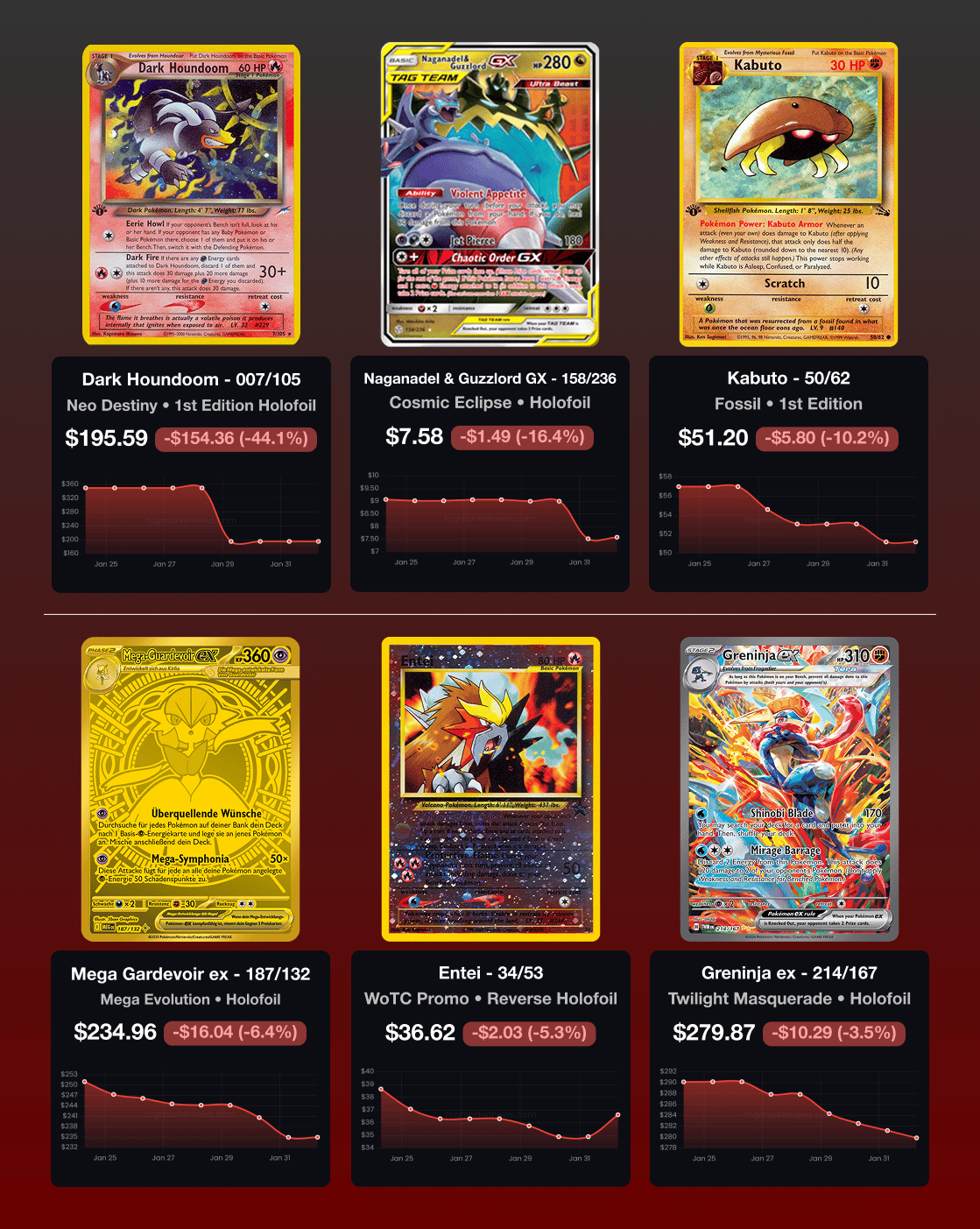 Sign Up January 26th - February 1st, 2026 🏆 Card of the Week: This Giratina card is featured in Japanese 11th Movie Commemoration Set as 005/009. It is illustrated by Kagemaru Himeno. This unique promo card depicts Giratina in its Origin Forme and was released exclusively in Japan to commemorate the 11th Pokémon movie. 📰 TCG News Note: Some updates may touch on wider Pokémon news beyond the TCG. 🔵 Creatures Inc. Announces Japanese Booster Pack Price Hike Creatures Inc. has announced that the Japanese Pokémon Trading Card Game booster packs for sets released after May 2026 will rise from 180 yen to 200 yen due to rising material costs and other factors, with 30-pack booster boxes likely increasing from 5,400 yen to 6,000 yen (about $4 more per box). It is the first pack MSRP increase since October 2022 (the Pokémon Scarlet and Violet era), and it is still unclear whether The Pokémon Company International will mirror any changes outside Japan. (Source: PokeBeach) 🔵 Rare 1st Edition Machamp Uncut Sheet Accidentally Mailed to Journalist A Connecticut journalist received a shock delivery when a shipping tube containing a rare 1999 1st Edition Machamp uncut sheet arrived at his doorstep by mistake. The vintage production item, which features 110 copies of the specific holo card found in the original 2-Player Starter Set, is estimated to be worth thousands of dollars. The recipient, Joseph Tucci, a self-proclaimed “Pokémon nerd”, recognized the significance of the item immediately upon opening the misdirected package and promptly returned to the original sender. (Source: CT Insider) 🔵 Pokémon cards help boy through cancer treatment Seven-year-old Dylan Jeffs found comfort in opening Pokémon card packs during years of acute lymphoblastic leukaemia treatment at Birmingham Children’s Hospital, giving him something to look forward to during intensive chemotherapy and a way to stay connected while isolated. After ringing the end-of-treatment bell in April 2024, Dylan relapsed months later and underwent a stem cell transplant using a cord blood match; his mum Rachael said her instincts caught the relapse early, and the family credits Pokémon cards with helping him stay motivated and reconnect with friends once he returned to school. (Source: BBC News) 📈 Card Trends Source: Price data provided by TCGPlayer.com and chart visual provided by TCGMarketNews.com (which sources data from TCGPlayer). Top Gains 🔼 Top Losses 🔽 🔢 Card Market Highlights 📦 Sealed Product Market Highlights 🔵 XY Base Set Booster Box Sells for ~$3.2k Listing Sealed Type - Year: Booster box - 2014 Comps spiked in late Sep/early Oct with multiple sales in the mid–high $3k range, but the most recent comps have it closer to the low-$3k band. 🔵 20th Anniv. Mew & Mewtwo Collection Box Sells for $2k Listing This is the Generations Super-Premium Collection which is a special anniversary box centered on Mewtwo and Mew collectibles and premium extras (including display items) alongside packs. Sealed Type - Year: Super-Premium Collection box - 2016 🔵 Japanese Tag Bolt Booster Box Sells for $1.6k Listing Japanese Tag Bolt was the first set to introduce Tag Team Pokémon cards which helped drive long-term sealed demand due to their unique art and popular demand. Sealed Type - Year: Booster box - 2018 ⭐ Singles & Graded Cards Highlights 🔵 PSA 10 2016 Japanese Pikachu Festa Promo Sells for $26.5k Listing The card was given to attendees of the exclusive Pokémon Card Game 20th Anniversary Festa held in Japan in October 2016. Singles Type - Condition: Graded - PSA 10 🔵 Ascended Heroes Mega Gengar Sells for $1.4k Listing Ascended Heroes released just 3 days prior to this edition on January 30, 2026. Singles Type - Condition: Ungraded - NM 🔵 PSA 10 Cradily ex Sells $1.85k Listing There are 28 copies in a PSA 10 out of 515 total. Singles Type - Condition: Graded - PSA 10 🕰️ Vintage & Niche Market Highlights 🔵 2010 Pikachu World Collection Folder Sells ~$1.8k Listing This special 9-card folder features Pikachu cards printed in nine different languages (English, Italian, Korean, Spanish, Japanese, German, French, Polish, and Portuguese). The standard Blue binder was sold at Pokémon Centers, while the rarer Green binder was a 7-Eleven Japan exclusive. The Green version includes a unique Japanese Pikachu with a green background, making it a premier chase for completists. Origin Source - Year: Promotional Folder - 2010 Interestingly, a factory-sealed Blue folder sold for $1,900 in January 2026, nearly matching the price of a single PSA 10 graded card from the same set, illustrating the high value collectors place on original sealed packaging. 🔵 PSA 10 Red/Green Gift Set Mewtwo Sells for ~$2.6k Listing This vintage Holo Mewtwo originates from the 1998 Japanese “Quick Starter” Red/Green Gift Set, a classic fixed-list product designed to teach new players the game. “No Rarity” generally refers to the very first print run of Japanese Pokémon cards characterized by a lack of rarity symbols present on later cards from later print runs. Origin Source - Year: Red/Green Gift Set - 1998 🔵 World Championships No.4 Trainer Stamped Pikachu Trophy Sells for $26.3k Listing This trophy card was awarded to fourth-place finishers at the 2015 Pokémon World Championships in Boston. Only six copies were officially distributed (one for each age division). Origin Source - Year: 2015 World Championships Market Insight: For cards of this level of exclusivity, the buyers that determine the price are less than a handful. 😴 Sleeper Pick This Galarian Slowking V card is one of many Komiya cards that spiked in 2025 that have settled a bit over the past few months. It has very cool art from one of the TCG’s most prolific artists and even PSA 10 prices are still quite a bit under $200. Additionally, Chilling Reign as a whole is a set with many top chase cards and sustained sealed demand. 📜 P