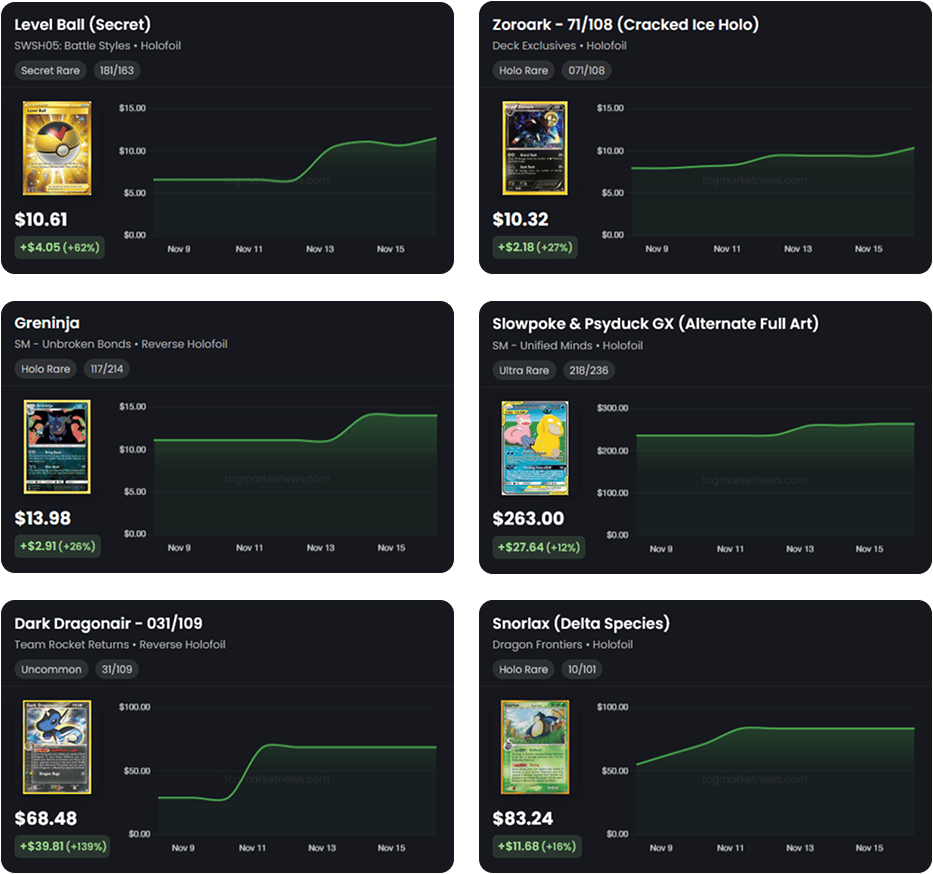 Sign Up November 10th - November 16th, 2025 📋 TLDR 📰 TCG News: Best Buy rolls out new invitation only system for Pokémon TCG drops, the Pokémon Day 2026 collection debuts the 30th anniversary logo, and Pokopia updates reveal four new regional variants which may spark the question of whether they could appear in future card releases. 🔢 Card Market Highlights: Japan Post Stamp Box climbs to ~$2k, a PSA 10 Armored Mewtwo hits ~$6.3k, and a PSA 9 Tropical Mega Battle Whitney’s Furret sells for ~$27.5k 😴 Potential Sleepers: Prism Star cards - Celestial Storm Latias - Affordable in near mint condition despite low PSA 10 gem rates and might hold a similar appear to Gold Star cards long term. 🏆 Card of the Week: Shedinja from English EX Deoxys #14 and Japanese Clash of the Blue Sky #38 illustrated by Yukiko Baba. The sparkling holo and somewhat eerie forest background in this card pairs really with Shedinja - a Pokémon described as being a hollow shell floating through the air while its body parts (like the wings) remain immobile. 📰 TCG News Note: Some updates may touch on wider Pokémon news beyond the TCG. 🔵 Best Buy Moves to invitation only system for Pokémon TCG releases Best Buy is shifting all future Pokémon TCG product drops in the U.S. to an invitation based system, something no other major retailer has tried yet. Instead of racing against bots on release day, buyers now have to log into their Best Buy account, request an invite on the product page, and wait to see if they are selected. Those who receive an approval email get a 24 hour window to complete their purchase. Behind the scenes, Best Buy is using an algorithm to filter out accounts that look like bots or bulk resellers by weighing factors like purchase history and user behavior. The system is only being used for Pokémon cards, not other categories, and in store buying will remain unchanged. (Source: PokéBeach) 🔵 Pokémon Day 2026 collection revealed – Pokémon 30th Anniversary logo first shown A new product celebrating Pokémon Day 2026 has been officially revealed, marking Pokémon’s 30th anniversary. The set will be released on January 30, 2026 with an MSRP of $14.99 USD. It includes a specially stamped foil promo card featuring Pikachu with a "Pokémon Day 2026" stamp, a metallic coin bearing the new 30th anniversary logo, and three Pokémon TCG booster packs from different expansions. The brand new 30th anniversary logo also made its first appearance as part of this reveal. This product ushers in a major celebratory year for Pokémon as the franchise enters its third decade. (Source: PokeGuardian) 🔵 Pokopia’s New Regional Variants - Could we see these in a future card release? The four new regional variants introduced for Pokopia add some fresh personality to the game. It does make me wonder whether these designs might eventually show up in the TCG. Pokémon has a long history of using card releases to highlight new forms and regions and tie into games, so it would not be surprising to see these variants adapted into card artwork at some point. Whether it ends up being a small promo run or part of a larger set, it could be an interesting way to support interest in the game and give collectors something new to look forward to. 📈 Card Trends Source: Price data provided by TCGPlayer and 7 day data breakdown provided by TCGMarketNews (which sources all data from TCGPlayer). Top Gains 🔼 Top Losses 🔽 🔢 Card Market Highlights 📦 Sealed Product Market Highlights 🔵 Pokémon Japan Post Stamp box sells for ~$2k Listing The Pokémon Japan Post Stamp Box is a collaboration product between Japan Post and The Pokémon Company that was released in Japan in 2021 at a price of 4,000 yen (about $36 at the time). It includes several items including a sheet of postage stamps and most notably, two promos featuring Pikachu and Cramorant inspired by traditional Japanese art pieces. Some boxes on the secondary market are sold without the original stamp sheet due to resale restrictions on unused Japanese postage. Prices for this box were around $1400 in July and have been steadily rising to the $2k mark. 🔵 Heart Gold Soul Silver Collection box sells for ~$1.8k Listing This collection box contains five HeartGold & SoulSilver series booster packs. While the exact packs can vary, a common configuration is one Undaunted, two Triumphant, one Unleashed, and one Base set pack. The box also includes an Entei figure and three collectible foil cards. Undaunted packs go for about ~$250, Triumphant for ~$220, Unleashed for about ~$170, and base set HGSS packs for ~$250. 🔵 Celestial Storm booster box sells for $1.8k Listing The top chases of this set are the Rainbow Rayquaza GX #177 (PSA 10 ~$900), #160 (PSA 10 ~$750), #177a (PSA 10 ~$500) - 3 different variations of the same Rayquaza card. In this mix as well is the Lisia #164 (PSA 10 ~$700). Both the booster box prices and top chase card prices have been going up and down quite a bit. In mid-July, there were several booster box sales at around $2.3k. 💎 Singles & Graded Cards Highlights 🔵 Lot of 80 PSA 10 Chinese Gem Pack 2 Umbreon sells for $32k Listing Note: Many of these lots of Chinese cards have been sold by the same seller over the past few months. In June-July, PSA 10 copies of this card were going for around $900 (about a month after Gem Pack Volume 2 released in China). Since then, this card has come down significantly with several sales in the ~$360 range. Even this lot sale puts the card price in a similar range at ~$400. At this price, this Umbreon card might be a solid pick up especially as it is a Chinese exclusive. 🔵 PSA 10 Armored Mewtwo sells for ~$6.3k Listing The Armored Mewtwo promo (SM228) was released in 2019 as part of the Fall Collector’s Chest where it was packaged alongside the Charizard and Pikachu promos from the same lineup. The card is based on Mewtwo’s appearance in the movie Mewtwo Strikes Back: Evoluti