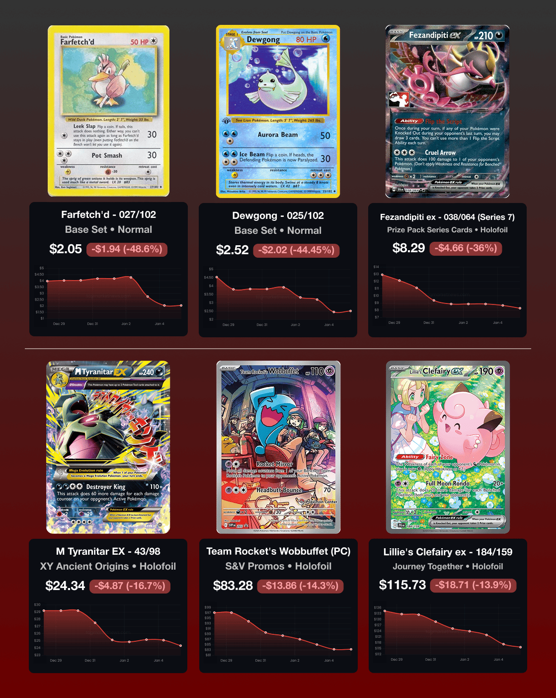 Sign Up December 29th - January 4th, 2025 📋 TLDR 📰 TCG News: McDonald’s Pokémon TCG Returns for 2026 🍔, Meet the Artists Who Made Their Pokémon TCG Debut in 2025 🎨, Pikachu-Themed, Mobile Pokémon TCG Shop in Singapore 🚚⚡ 🔢 Card Market Highlights: Majestic Dawn Diamond & Pearl Booster Box Sells for $19k 🌅, Ishihara & Akabane Signed Plusle/Minun Sells $7.2k 🔴, Dark Golbat Missing Print Layer Error Card Sells for $25k 🦇 😴 Potential Sleepers: Magneton #159 - Pokemon Center Stamp Promo ⚡ 🏆 Card of the Week: This Relicanth card is featured in English EX Hidden Legends as 24/101 (left) and in Japanese Undone Seal as 36/83 (right) - Illustrated by Kagemaru Himeno. Relicanth is a deep-sea “living fossil” Pokémon, and this artwork leans into that ancient-ocean vibe with a calm, mysterious underwater scene. 📰 TCG News Note: Some updates may touch on wider Pokémon news beyond the TCG. 🔵 McDonald’s Pokémon TCG Happy Meal Promotion Returns to the U.S. for Pokémon’s 30th Anniversary 🍔 McDonald’s is expected to run another Happy Meal Pokémon TCG promotion in the U.S. in February through March 2026 as part of Pokémon’s 30th anniversary celebrations, though exact timing and details have not been fully announced. These promos typically include a small booster pack of reprint cards, often with one holo card and a compact set size. (Source: Pokébeach) 🔵 Meet the Artists Who Made Their Pokémon TCG Debut in 2025 🎨 (Source: Pokémon) 🔵 Pikachu-Themed “CardTruck SG” Turns a Van Into a Mobile Pokémon TCG Shop in Singapore 🚚⚡ As demand for Pokémon trading cards stays strong, a new Singapore seller is taking a mobile-first approach instead of relying on card shows or storefronts. Ace left a six-figure IT job to launch CardTruck SG, a bright yellow Pikachu-themed van that drives around Singapore selling mainly sealed products and running live selling plus customer-requested livestream unboxings, while avoiding loose packs due to “filtering” concerns. He says he invested about $120,000 in the van and $40,000 in the setup, pricing items around market with optional delivery fees. (Source: AsiaOne) 📈 Card Trends Source: Price data provided by TCGPlayer.com and chart visual provided by TCGMarketNews.com (which sources data from TCGPlayer). Top Gains 🔼 Top Losses 🔽 🃏 Card Market Highlights 📦 Sealed Product Market Highlights🔵 Majestic Dawn Diamond & Pearl Booster Box Sells for $19kListing Majestic Dawn from the 2008 D&P expansion is best known for the continued feature of LV. X cards. Majestic Dawn is among nearly vintage sets where top chase cards are usually in the single digit for PSA 10 graded cards and booster boxes very rarely coming up for sale. When they do, the sales are staggeringly high. There were two other sales of this booster box for $5-$6k in 2023. 🔵 Lot of 973 S&V 151 Booster Packs Sells for ~$11.1kListing A bulk lot of 973 S&V 151 booster packs selling for approximately $11.1k works out to roughly $11.41 per pack. Big lot sales like this are especially useful as market signals because they reflect what a buyer will pay for instant scale but the buyers in this case are typically streamers opening packs on a live stream (to sell or just for making content) or card shops. S&V 151 is most commonly sold as a half booster bundle containing 6 packs for which the market price is around $70 working out to about $11-$12. 🔵 1st Edition Japanese Tidal Storm Booster Box Sells for $4kListing Tidal Storm (XY5-B) released at the end of 2014 and is the Kyogre half of XY5 that introduced Ancient Traits alongside heavy hitters like Kyogre/Primal Kyogre lines. Although a bit newer than Majestic Dawn, it still falls into a similar Niche set but this time in Japanese which is potentially more scarce especially as a booster box that was also released in 1st Edition. This set is one part of the English release of XY Primal Clash in English (which are in the $3k-$4k). ⭐ Singles & Graded Cards Highlights 🔵 Lot of 25 Van Gogh Pikachu Sells for ~$12.4k Listing Van Gogh Pikachu is up nearly 100% in the past year with raw prices in a PSA 10 also up around $1.5k. Raw and graded prices have dipped in the past 3 months. This sale of sealed raw copies (which is how they were distributed) puts each copy near $500 which is about the current market price. This might just be another dip for the next jump in 2026. 🔵 Tsunekazu Ishihara Signed Minun & Takumi Akabane Signed Plusle Sells $3.7k Each Plusle Listing & Minun Listing Tsunekazu Ishihara is the longtime President/CEO of The Pokémon Company and Takumi Akabane is likewise tied to the TCG’s earliest creation/creative leadership (and is also known as a TCG illustrator). The Plusle/Minun these signatures are associated with the EX Trainer Kit 2 (2006), a sealed learn-to-play product with two half decks (Plusle + Minun) plus an EX-series booster pack and play accessories. 🔵 PSA 10 Victory Cup Battle Carnival 3rd Place Sells for $16k Listing Victory Cup (Battle Carnival 2011) – 3rd Place is the placement trophy promo awarded to 3rd-place finishers in the Climax Stage of the open-entry Victory Cup tournament at Pokémon Battle Carnival 2011, held at Mydome Osaka (November 5–6, 2011) and Sunshine City Tokyo (November 19–20, 2011). Only 6 copies of each placement Victory Cup were printed with the 2011 designation. 🕰️ Vintage & Niche Market Highlights 🔵 PSA 10 No Rarity Symbol Item Finder Sells for $13k Listing No Rarity Symbol Item Finder is a Japanese 1996 Base Set (“Expansion Pack”) Trainer from the earliest print run, identifiable because it lacks the rarity icon in the lower-right corner that later Japanese Base Set prints include. Despite the fact that this seems like a standard Trainer card with nothing special about it but the fact that it’s from the earliest print run makes it easily just as desirable. There are 5 other copies in a PSA 10 