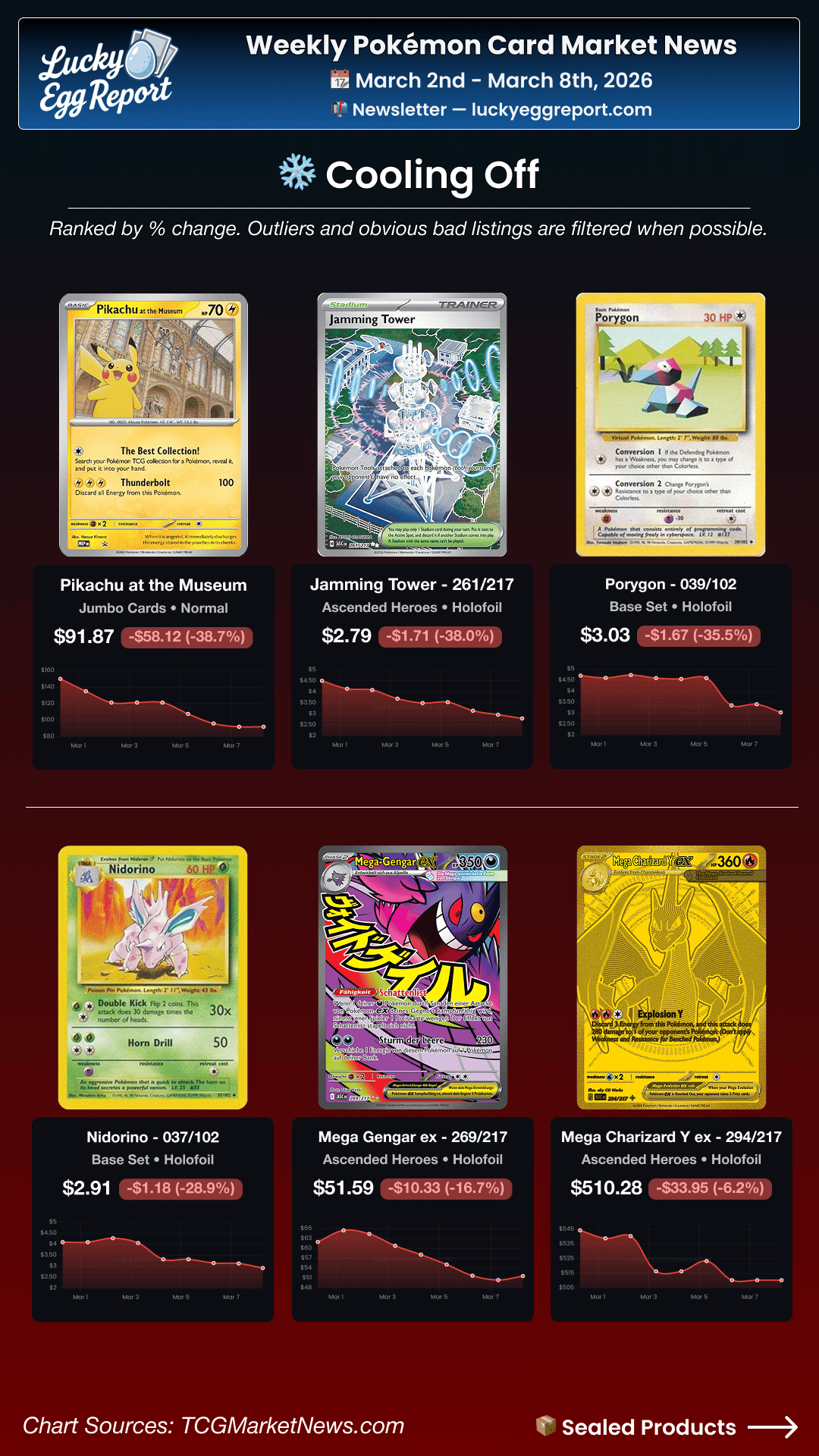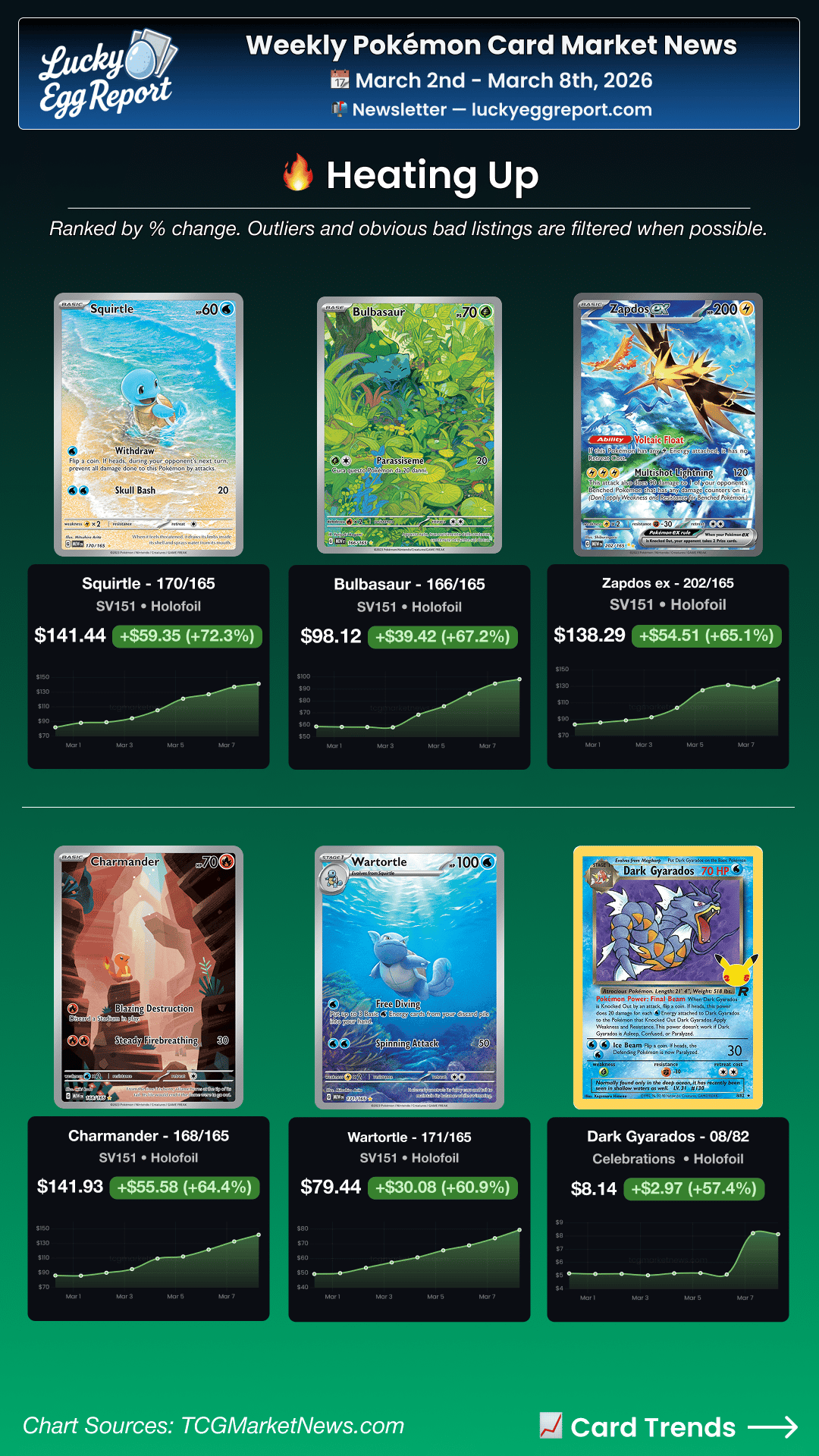 The Lucky Egg Report delivers the week’s most interesting Pokémon card market news straight to your inbox: TCG news 📣, weekly price trends 📈, sales highlights 📊, and more!