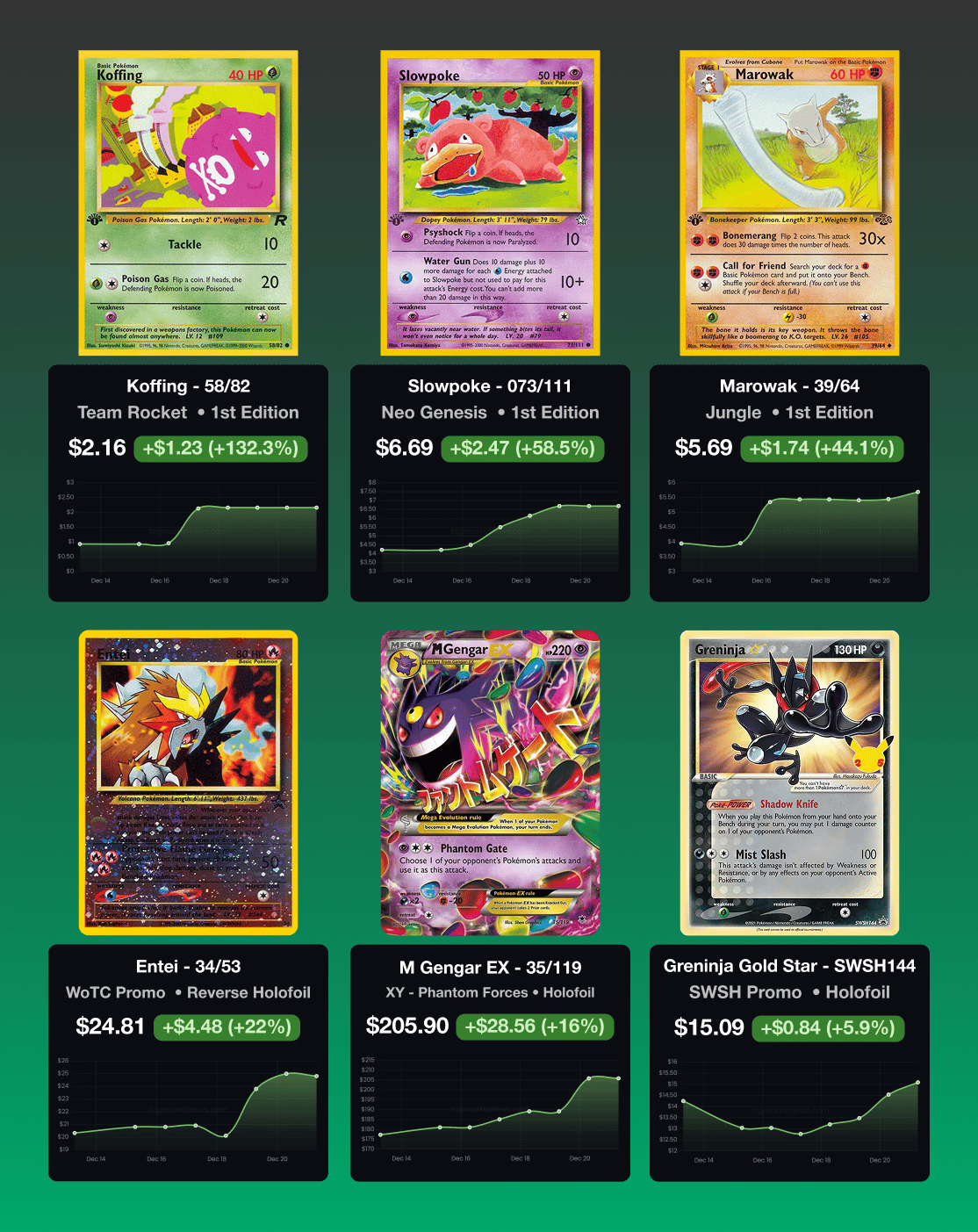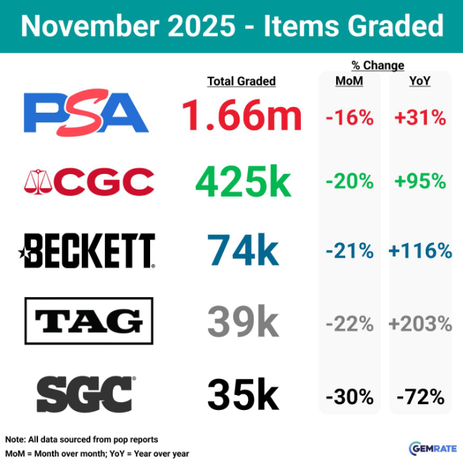 Sign Up December 15th - December 21st, 2025 📋 TLDR 📰 TCG News: PSA’s Parent Company Buys Card-Grading Rival Beckett, Pokémon Company Leases 1 Million+ Sq Ft To Print Cards, Secret Rares From “Start Deck 100 Battle Collection” Revealed! 🔢 Card Market Highlights: Japanese Blue Sky Stream Booster Box Sells for $560, TAG 10 Chinese 151 Collection Pikachu Sells for ~$810 + Promos (McDonald’s Squirtle and Pichu Bros.), Japanese CoroCoro Unpeeled Promo Sheet Sells for $10k 😴 Potential Sleepers: Crown Zenith - Mew GG10/70 🏆 Card of the Week: Golisopod ex from English Paradox Rift 246/182 and Japanese Ancient Roar 088/066, illustrated by Oku. This set of two cards do a great job of showing Golisopod’s transition from bolting at the first hint of danger, to taking on any challenge as a trained fighter 📰 TCG News Note: Some updates may touch on wider Pokémon news beyond the TCG. 🔵 PSA’s Parent Company Buys Card-Grading Rival Beckett Collectors has purchased Beckett; financial terms were not disclosed, and Beckett will remain an independent brand within Collectors with no current pricing changes. The acquisition includes Beckett’s Comic Book Certification Service but does not include Southern Hobby Distribution or Dragon Shield; GemRate figures cited show PSA at over 75% of weekly grading volume, CGC just over 18%, and Beckett nearly 3%. (Source: ESPN) 🔵 Pokémon’s Millennium Print Group Signs Largest U.S. Manufacturing Lease of 2025, Will Occupy 1.27 Million Square Foot Campus to Print Cards Millennium Print Group will occupy a 1.27 million-square-foot campus at Spark in Morrisville, North Carolina, described as the largest U.S. manufacturing lease signed in 2025. Millennium will lease 400,000+ square feet of existing buildings and receive a newly constructed 866,000-square-foot manufacturing facility slated for completion in 2027; TPCi is quoted as printing at max capacity amid shortages. (Source: Pokébeach) 🔵 Secret Rares From “Start Deck 100 Battle Collection” Revealed! Secret Rares are already appearing on social media, and the product is set to release on December 19 for 891 yen (just under $6). The lineup includes Secret Rares #747–#766, each tied to specific deck numbers, with Mega Meganium ex, Mega Emboar ex, and Mega Feraligatr ex all found in Deck 101. Cards from Japan’s MEGA Dream ex and Start Deck 100 Battle Collection are also expected to show up in January’s special Ascended Heroes set. (Source: Pokébeach) 📈 Card Trends Source: Price data provided by TCGPlayer.com and chart visual provided by TCGMarketNews.com (which sources data from TCGPlayer). Top Gains 🔼 Top Losses 🔽 🔢 Card Market Highlights 📦 Sealed Product Market Highlights 🔵 Regigigas Lv. X Collector’s Tin Sells for $1.4k Listing This contains Regigigas promo DP30 along with four booster packs: two from the Platinum expansion, one from Rising Rivals, and one from Stormfront. There are only 4 in a PSA 10 and one of the last known sales was in July 2024 for ~$3.7k. Booster packs from all 3 sets go for about $200-$250. Near mint copies of the Regi promo go for about $30 but with a total of 361 graded and 4 PSA 10s it might just be a very difficult card to grade. But these tins also very rarely come up for sale. 🔵 S&V 151 Pokémon Center ETB Sells for $600 Listing PC (Pokémon Center) stamped ETBs and the similarly stamped promos that come with them are the modern equivalent of first edition cards. Recent sales have come down a bit from highs of $900-$1k to $600-$700. Sales of the stamped Snorlax promo have also come down from around $1.5k to $1k in a PSA 10. 🔵 Japanese Blue Sky Stream Booster Box Sells for $560 Listing Japanese Blue Sky Stream is the Japanese equivalent of one part of Evolving Skies. The top chase of this set is Rayquaza VMAX #83 (PSA 10 around $3.5k, which is more than double its English counterpart from Evolving Skies). This set had a much lower print run and recent sales are actually closer to the $600-$700 range. This sale seems to be a slight outlier but overall prices are going up from around $400 mid year. 💎 Singles & Graded Cards Highlights 🔵 PSA 10 McDonald’s Squirtle Promo Sells for ~$4k Listing Squirtle #7 is a Japanese promo card from the 30-card McDonald’s Pokémon-e Minimum Pack set, released exclusively in Japanese McDonald’s restaurants from January 26 to February 24, 2002. These six-card packs came in each Happy Meal during the campaign and were compatible with Nintendo’s e-Reader. This sale is on the slightly lower end of the peak $4.3k range from a couple months ago but overall this card is up over 400% from roughly $800 PSA 10 sales back in February. 🔵 TAG 10 Chinese 151 Collection Pikachu Sells for ~$810 Listing TAG 10 Gem MT is one level below Pristine, which might roughly equate to a CGC 10 Pristine (with the gold label). The Chinese card market as a whole has corrected downwards a bit since it exploded earlier this year with each wave of S&V sets releasing alongside a Chinese exclusive Pikachu. PSA 10 prices are not that far behind with some recent sales in the past month as low as $725 and as high as $900. You can see a full report of how this card was graded here. 🔵 PSA 10 Japanese Movie Promo Pichu Bros Sells for $745 Listing Pichu Bros. is a Japanese Movie Promo card, numbered 028/P, released in 2002 as part of the fifth Pokémon movie campaign tied to Guardian Gods of the City of Water: Latias and Latios. It was distributed in Japan as a bonus to audience members who prebooked theaters tickets before the movie premiere in July. There are 146 in a PSA 10 with a total of 310 graded. Recent sales are in the same range but up about $400-$500 mid-year. 🕰️ Vintage & Niche Market Highlights 🔵 Japanese CoroCoro Unpeeled Promo Sheet Sells for $10k Listing The 1996 Glossy Pikachu & Jigglypuff Japanese CoroCoro promo is an unpeeled 2-card sheet that was distributed as a magazine insert w