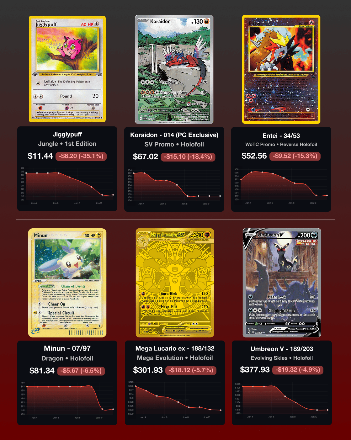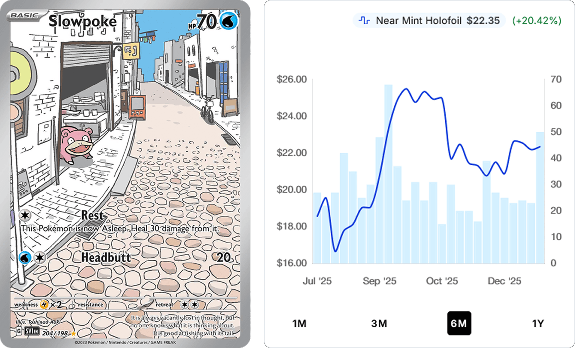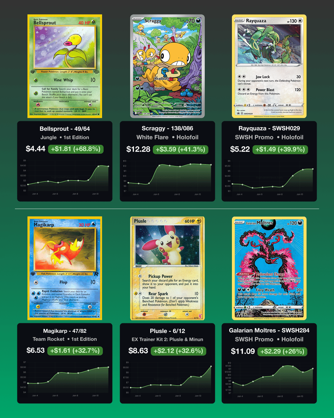 Sign Up January 5th - January 11th, 2026 📋 TLDR 📰 TCG News: Pokémon × Natural History Reveals Pikachu Jumbo Card 🏺, Destroyed Charizard Card Sells for $550🔥, “Gem Pack Vol 4” to Release in China Featuring Springtime Pokemon! 💐 🔢 Card Market Highlights: PSA 10 Gold Star Gyarados Sells Near $100k 🤯, Phantasmal Flames Booster Box Sells Down 23% 📉, PSA 3.5 Dragonite Sells $5.5k 🐲 😴 Potential Sleepers: S&V Base Set - Slowpoke #204/198 🏆 Card of the Week: This Gyarados “New Year Present” is a Japanese Pokémon Card Fan Club jumbo postcard promo released in 2000 to celebrate the new millennium. Illustrated by Tomokazu Komiya, it was mailed to Fan Club members and tied to the club’s GET Points program (members received an additional 200 points). It’s so cool to see these unique holiday based promos that are not as common in the modern TCG. 📰 TCG News Note: Some updates may touch on wider Pokémon news beyond the TCG. 🔵 Pokémon × Natural History Presents “Pokécology” 🏺 A Pokémon × Natural History Museum “Pokécology” pop-up shop runs at the Cranbourne Boutique 26 Jan–19 Apr 2026, inspired by Pokécology: An Illustrated Guide to Pokémon Ecology and themed around nature (evolution and environment). An oversize TCG promo “Pikachu at the Museum” is a gift with purchase at the pop-up and at select UK retailers on 30 Jan, with select merchandise also available via Pokémon Center and the museum’s online shop (worldwide shipping while stocks last). (Source: Pokemon UK) 🔵 This Rare Charizard Card Sold for $550 Despite Being Nearly Destroyed 🔥 In a testament to the enduring value of "Holy Grail" Pokémon cards, a nearly destroyed Charizard Star (Gold Star) from the 2006 EX Dragon Frontiers set recently sold on eBay for $550. Despite being described by the seller as "trashed" and "the world’s worst" copy, the card found a buyer willing to overlook severe water damage, warping, and a back that had almost entirely delaminated. While an ungraded copy in decent condition typically fetches around $1,800, this sale proves that for iconic cards like the Charizard Gold Star, collectors are often willing to pay a premium just to own a piece of history regardless of its "identifiable" state. (Source: Beckett) 🔵 “Gem Pack Vol 4” to Release in China Featuring Springtime Pokemon! 💐 Pokémon China has officially announced the upcoming release of “Gem Pack Vol. 4” (CBB4C), scheduled to hit shelves in Mainland China on February 6, 2026. This latest installment in the popular Gem Pack series is designed to celebrate both the arrival of Spring and the "Year of the Horse." A major highlight of the set is a brand-new, Simplified Chinese exclusive Ponyta illustration card, featuring artwork by Minaminami Take. (Source: Pokébeach) 📈 Card Trends Source: Price data provided by TCGPlayer.com and chart visual provided by TCGMarketNews.com (which sources data from TCGPlayer). Top Gains 🔼 Top Losses 🔽 🔢 Card Market Highlights 📦 Sealed Product Market Highlights 🔵 Phantasmal Flames Booster Box Sells for ~$235 Listing Sealed Type - Year: Booster Box - 2025 Contents: 36 booster packs Market Insight: Another sale of this box reached ~$320 in October 2025 (about -23% vs current); prices have stabilized a bit following the initial release. 🔵 D&P Darkrai Lv. X Tin Sells for ~$1.45k Listing This collector's tin features the Darkrai LV.X DP19 promo, which has a low PSA 10 population of just 20. It typically contains four Diamond & Pearl series booster packs: two Secret Wonders, one Great Encounters, and one Mysterious Treasures. Sealed Type - Year: Collector’s Tin - 2008 Contents: 4 Diamond & Pearl Series booster packs and 1 Darkrai LV.X foil promo card (DP19). Market Insight: Another sale of this variation went for $950 in April 2025. The Dialga Lv. X tin variation sold for $1.25k in September 2025. 🔵 Serperior Battle Action Tin Sells for $975 Listing This variant of the "Evolved Battle Action" tin was released during the early B&W era. Unlike the standard five-pack version which also comes with a figure, this tin contains a single promo card and three booster packs. Sealed Type - Year: Collector’s Tin - 2011 Contents: 3 Booster Packs (Noble Victories / Black & White series), 1 Serperior BW20 Promo Card (Only 1 PSA 10). Market Insight: Another sale of this tin went for $520 in June 2025. ⭐ Singles & Graded Cards Highlights 🔵 Lot of 205 XY Pikachu Lego Movie Promo Sells for $3k Listing This Pikachu promo was distributed during the 2014 theatrical release of The LEGO Movie. The card is a cosmos holofoil reprint of the Pikachu originally found in the English XY base set. These were primarily distributed in sampling packs at cinemas. Singles Type - Condition: Raw promo (Cosmos holo) - Cellophane sealed Set Name - Year: XY Base Set / Promo - 2014 Market Insight: This bulk sale averages ~$14.63 per card which has been the rough average market price over the last 6 months. 🔵 CGC Pristine 10 Evolving Skies Umbreon VMAX Sells for $5k Listing - This sold listing was confirmed through eBay’s internal tools but there is an error with the listing page Singles Type - Condition: Graded - CGC Pristine 10 Set Name - Year: Evolving Skies - 2021 Market Insight: A CGC Pristine 10 often commands a 20-50% premium (just an estimation) over a standard PSA 10, as the label is often associated with a higher grading standard for centering, surface quality, etc. Similar PSA 10 Moonbreon sales are around $3.5k in the last several weeks. 🔵 PSA 3.5 Team Rocket Returns Dragonite Reverse Foil Sells for $5.5k Listing Sets from this era are unique because the stamped cards signify the reverse holofoil variant, which featured lower pull rates and more intricate foil patterns. This specific Dragonite variant is distinguished by its gold foil name and HP text, paired with a distinct and incredibly unique energy symbol holofoil pattern throu