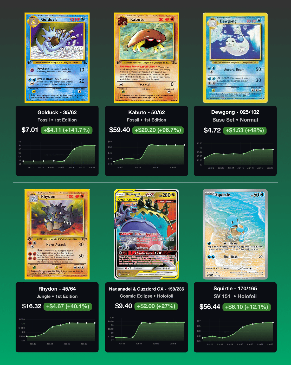 Sign Up January 5th - January 11th, 2026 📋 TLDR 📰 TCG News: Pokémon × Natural History Reveals Pikachu Jumbo Card 🏺, Destroyed Charizard Card Sells for $550🔥, “Gem Pack Vol 4” to Release in China Featuring Springtime Pokemon! 💐 🔢 Card Market Highlights: PSA 10 Gold Star Gyarados Sells Near $100k 🤯, Phantasmal Flames Booster Box Sells Down 23% 📉, PSA 3.5 Dragonite Sells $5.5k 🐲 😴 Potential Sleepers: S&V Base Set - Slowpoke #204/198 🏆 Card of the Week: This Gyarados “New Year Present” is a...