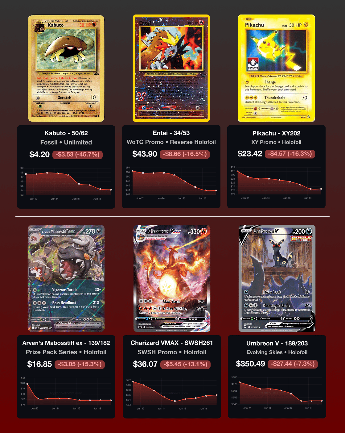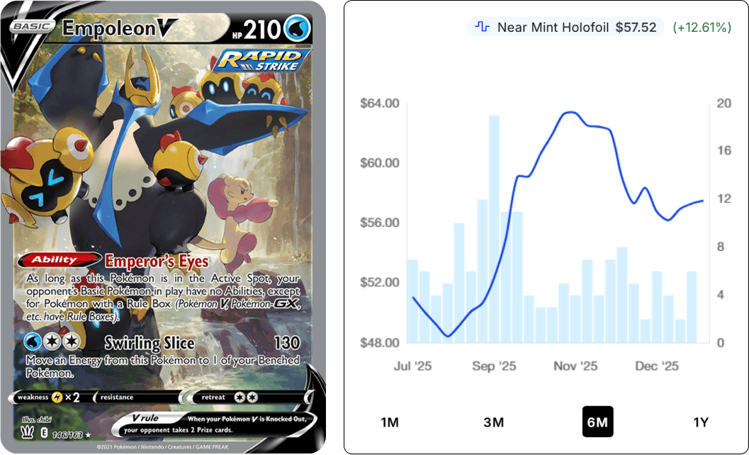 Sign Up January 12th - January 18th, 2026 📋 TLDR 📰 TCG News: Palworld Reveals New TCG, Nullifying Zero Set Cards Revealed, “2025 World Championship Decks” Revealed for April 🔢 Card Market Highlights: B&W Next Destinies Booster Box Sells for $11.75k, Start Deck 100 Pikachu Sells $620, Rare Goomy Card Sells $30k, Palworld Reveals New TCG 😴 Potential Sleepers: Battle Styles - Empoleon V (Alternate Art) #146 🏆 Card of the Week: This card’s mind-bending architecture is widely seen as an homage to M.C. Escher’s 1953 lithograph Relativity, echoing impossible staircases and warped gravity to reflect Palkia’s control over space. 📰 TCG News Note: Some updates may touch on wider Pokémon news beyond the TCG. 🔵 Palworld now coming for Pokémon TCG's lunch with its own card game Pocketpair has partnered with TCG specialist Bushiroad to launch the "Palworld Official Card Game" on July 30, 2026. This 2-player competitive game will adapt core mechanics from the video game, including resource management and base building. The first set will feature all-new illustrations for Pals like Lamball and Chillet rather than reused assets. The announcement comes amid Pocketpair's ongoing high-profile patent litigation with Nintendo and The Pokémon Company. (Source: Polygon) 🔵 “Nullifying Zero” All 80 Main Set Cards Revealed! The complete 80-card main set for Japan's Nullifying Zero has been unveiled ahead of its January 23 release. The expansion features the return of Mega Evolution with headline cards like Mega Zygarde ex, Mega Clefable ex, and Mega Starmie ex. These cards will form the core of the upcoming English set Perfect Order, launching in March. (Source: PokeBeach) 🔵 “2025 World Championship Decks” Revealed for April! Releasing April 3, 2026, for $19.99 each, these four replica decks feature the top performers from the 2025 Anaheim Worlds: Masters Champion Riley McKay (Gardevoir ex), Seniors Champion Liao Fu Guan (Gholdengo ex), Juniors Champion Yuya Okita (Raging Bolt ex), and Finalist Jose Cruz Galindo-Resendiz (Dragapult ex). Each deck includes a pin and accessories, though the cards feature special backs and are not tournament legal. (Source: PokeBeach) 📈 Card Trends Source: Price data provided by TCGPlayer.com and chart visual provided by TCGMarketNews.com (which sources data from TCGPlayer). Top Gains 🔼 Top Losses 🔽 🔢 Card Market Highlights 📦 Sealed Product Market Highlights 🔵 B&W Next Destinies Booster Box Sells for $11.75k Listing This booster box from the Black & White era, best known for introducing the "Pokémon-EX" mechanic and textured Full Art cards. Sealed Type - Year: Booster Box - 2012 Contents: 36 Booster Packs Market Insight: This auction sale represents a significant jump, rising ~24% from the $7,100 sale in August 2025 and showing a massive gain of ~120% since the $4,000 sale recorded in February 2025. 🔵 Japanese D&P 1st Edition Space Time Creation Booster Box Sells for $4k Listing This box contains the first Japanese expansion of the D&P era, which introduced Lv. X cards. The 1st Edition stamp of course marks this as the initial, limited print run. Sealed Type - Year: Booster Box - 2006 Contents: 20 packs Market Insight: Even for the unlimited version of this booster box, sales and price data are extremely scarce but this sale is in line with similar D&P era booster box sales in Japanese. For example, a D&P Moonlit Pursuit booster sold for ~$4k in November 2025. 🔵 2010 Entei Tin Sells for $2.1k Listing Sealed Type - Year: Collector’s Tin - 2010 Contents: 4 Vintage Booster Packs (HGSS & Platinum Era) & Shiny Entei Promo Market Insight: The $2.1k price tag is driven by the extreme desirability of sealed vintage tins that contain HGSS and Platinum eras (~$250), combined with the collectability of the Shiny Entei promo which actually has 0 cards in a PSA 10. A set of 3 of these tins (Entei, Suicune, Raikou) sold for $5k this week. ⭐ Singles & Graded Cards Highlights 🔵 PSA 10 D&P Reverse Holo Snorlax Sells for $12k Listing This is a Rare Reverse Holofoil Snorlax (37/130) from the 2007 Diamond & Pearl base set. While the non-holo and standard holo versions of this card are relatively common, the reverse holofoil variant is notoriously difficult to find. Singles Type - Condition: Graded - PSA 10 Set Name - Year: Diamond & Pearl - 2007 Market Insight: There are no adequate graded comparisons but near mint ungraded copies of this card average ~$54. As a pop 1 card in a PSA 10, this price reflects the obvious scarcity premium where no comparable public sales exist for the grade, forcing bidders to set a new market ceiling. 🔵 PSA 10 Best of XY Delinquent Sells for $2.85k Listing This Full Art Supporter was released in the Japanese-exclusive "High Class Pack Best of XY" and features artwork by Sanosuke Sakuma. The Best of XY set is a massive 171-card compilation that served as a final celebration of the XY era, featuring high-quality reprints and unique alternate-art cards. Singles Type - Condition: Graded - PSA 10 Set Name - Year: The Best of XY - 2017 Market Insight: This price marks a significant recovery (~50% vs September 2025 sale of $1,900 and ~94% vs February 2025 sale of $1,469). 🔵 Japanese Start Deck 100 Pikachu #764 Sells for $620 Listing The Pokémon Start Deck 100 collection works as a "gacha" or blind box system, where each package contains one random, pre-built 60-card deck out of 101 possible unique decks (the 101st is a “God Deck” featuring the art rare chase cards). Singles Type - Condition: Raw - Near Mint Set Name - Year: Start Deck 100 Battle Collection (Japanese) - 2025 Market Insight: The $620 sale reflects the extreme difficulty of pulling this specific single because of the Gacha nature of this set. But also Japanese cards always carry a premium on release until the English counterparts release. 🕰️ Vintage & Niche Market Highlights 🔵 Pokemon Topps Chrome Trading Cards Series 1 
